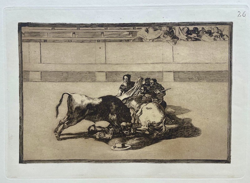Tauromaquia (1928) - 26. Caída de un picador de su caballo debajo del toro