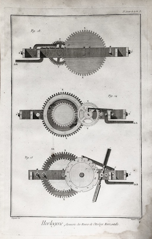 Estampa perteneciente a la monumental obra conocida como "L'Encyclopédie" o "Dictionaire raisonné des Sciences, des Arts et des Metiers", traducido en "Diccionario razonado de las ciencias, las artes y los oficios", y publicada entre los años 1751 y 1772 en Francia