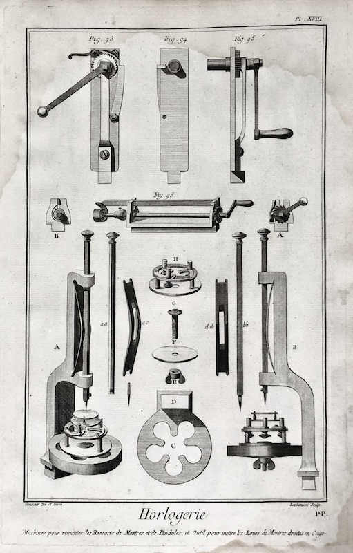 Estampa perteneciente a la monumental obra conocida como "L'Encyclopédie" o "Dictionaire raisonné des Sciences, des Arts et des Metiers", traducido en "Diccionario razonado de las ciencias, las artes y los oficios", y publicada entre los años 1751 y 1772 en Francia