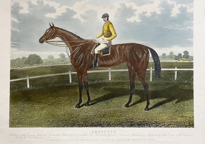Título completo: "SHOTOVER ; Winner of the Derby Stakes at Epsom 1882, Value £5,800, and the Two Thousand Guineas Stakes at Newmarket. The property of the Duke of Westminster. ; By Hermit out of Stray Shot. Bred by Mr. Chaplin. Trained by John Porter. Ridden by T. Cannon.".