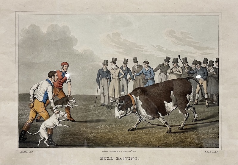 [Un] Grabado representando una escena de "hostigamiento de toros*", o "bull-baiting", un espectáculo popular en Inglaterra en el que toros atados eran molestados e inmovilizados por perros. Esta práctica se prohibió formalmente en 1835 con la aprobación de la Acta de Crueldad contra los Animales.