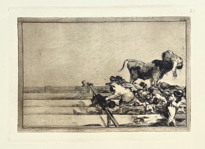 [Un] Grabado perteneciente a la serie "La Tauromaquia", un conjunto de grabados donde Francisco de Goya (1746-1828) retrató la historia, costumbres y figuras del toreo en España. A través de escenas dramáticas y llenas de movimiento, mostró tanto la destreza como la violencia del espectáculo. La obra combina su interés por las tradiciones populares con una mirada crítica y expresiva sobre la condición humana.