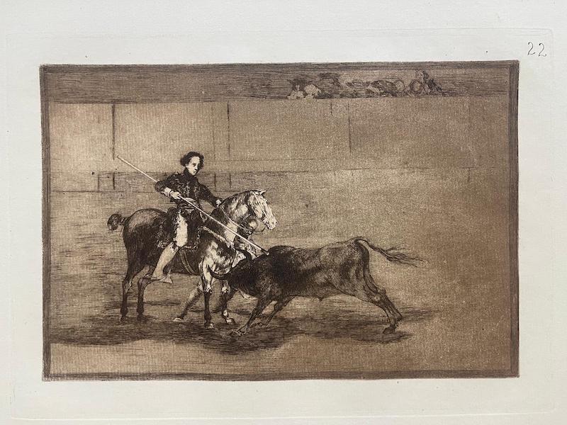 [Un] Grabado perteneciente a la serie "La Tauromaquia", un conjunto de grabados donde Francisco de Goya (1746-1828) retrató la historia, costumbres y figuras del toreo en España. A través de escenas dramáticas y llenas de movimiento, mostró tanto la destreza como la violencia del espectáculo. La obra combina su interés por las tradiciones populares con una mirada crítica y expresiva sobre la condición humana.