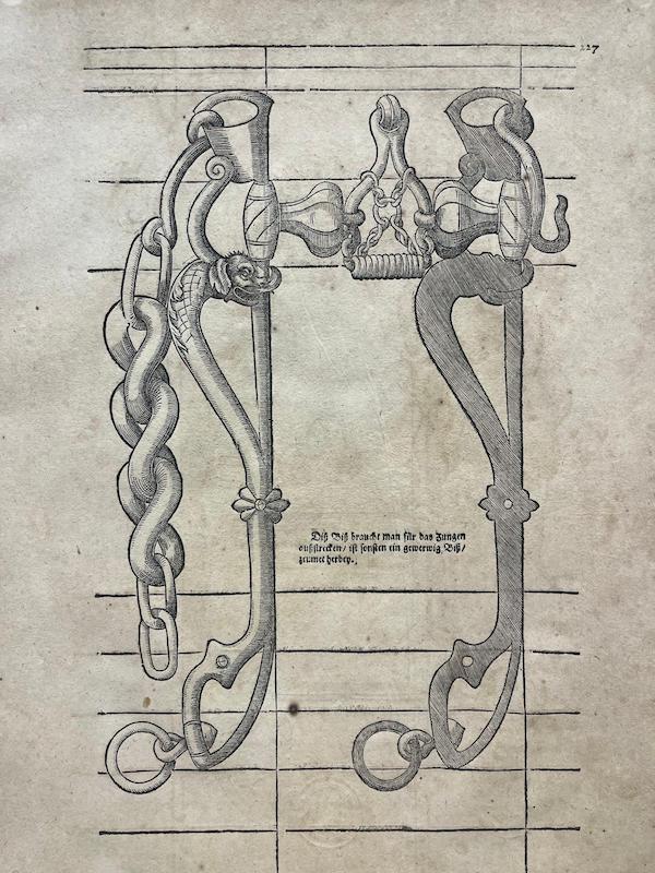 Esta obra fue publicada en Hanau, en Alemania, probablemente entre los años 1624 y 1630, y estos grabados representan diferentes modelos de frenos y bocados ecuestres en estilo renacentista tardío, propias de los manuales ecuestres y de guarnicionería del siglo XVII.
