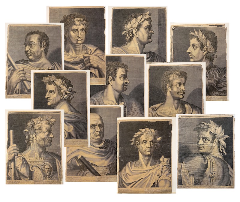 [11 Grabados] Serie en gran folio de retratos grabados de los Doce Césares, publicada en París por Pierre Mariette en su establecimiento de la Rue Saint-Jacques, “bajo el signo de la Esperanza” (via Iacobea sub signo Spei), hacia 1640-1650.