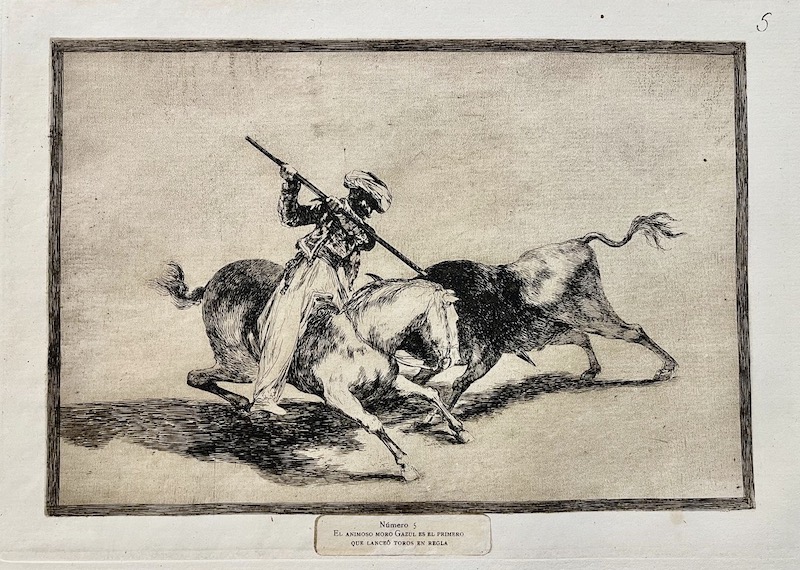 [One] Etching belonging to the "La Tauromaquia" series, a collection of prints in which Francisco de Goya (1746-1828) portrayed the history, customs, and figures of bullfighting in Spain. Through dramatic scenes filled with movement, he showcased both the skill and the violence of the spectacle. The work combines his interest in popular traditions with a critical and expressive gaze on the human condition.