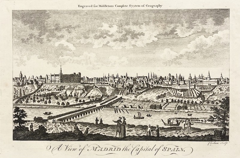 [Un] Grabado representando una vista de Madrid, tal y como se encontraba en el siglo XVIII, con sus gentes ataviadas de época.