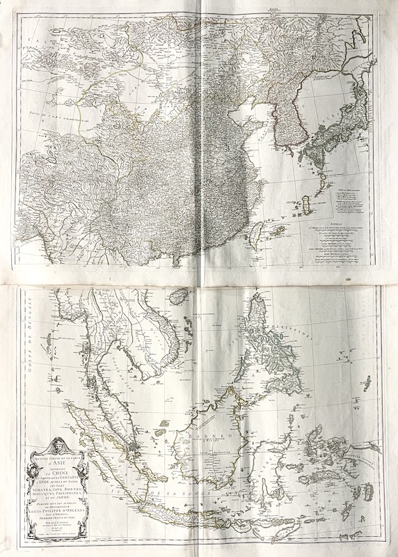 Tïtulo completo: "Seconde Partie de la Carte d' Asie contenant la chine et partie de la Tartarie, l'Inde au delà du Gange, les isles Sumatra, Java, Borneo, Moluques, Philippines, et du Japon. publiée sous les auspices de Monseigneur Louis-Philippe d'Orléans duc d'Orléans, premier Prince du Sang. Par le Sr. d'Anville Secrétaire de son Alt. Séreniss. MDCCLII. Avec Privilege. A Paris Chez l'Auteur, Aux Galeries du Louvre" .