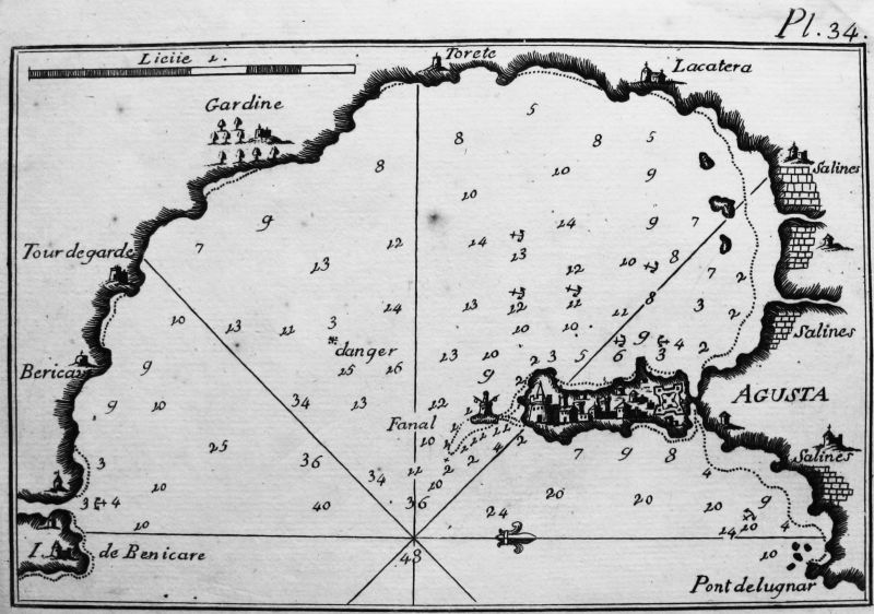 Colección "Recuel des Principaux Plans des Ports et Rades de la Mer Mediterranée" de Joseph Roux (1780-1854), Directo del Servicio Hidrográfico del rey en 1764, y dedicada a "Mns. Gr. Le Duc de Choiseul" Ministro de Guerra y Marina.