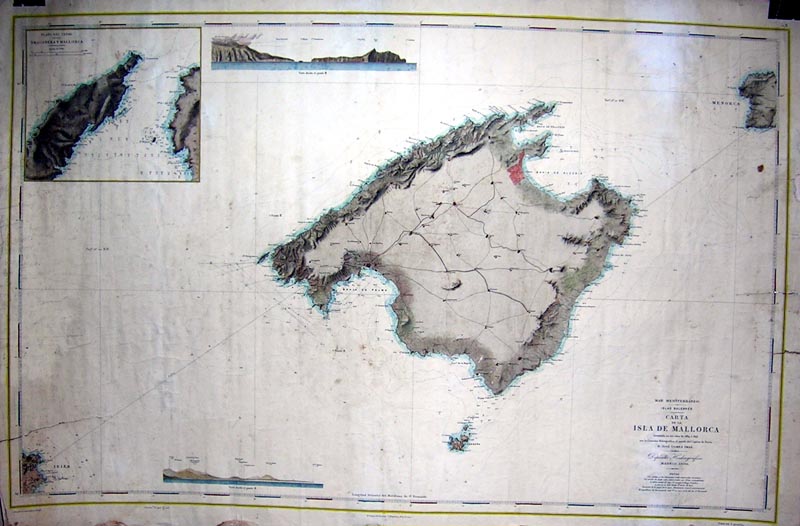 "Levantada en los años 1889 a 1893 por la Comision Hidrografica al mando del Capitan de Navío D. José Gomez Imaz. Deposito Hidrografico" Con parte de las islas de Menorca en Ibiza En margen superior izquierdo "Plano del canal entre Gragonera y Mallorca" L. Gonzalez la construyó y delineó Adiciones : 1905, 1908 E. Fungairiño la grabó S. Bregante y Mz gº la letra Anotaciones a lápiz en margen izquierdo, Márgenes deteriorados, Algunas rasgaduras en grabado y arrugas en el papel. Manchas de humedad. |