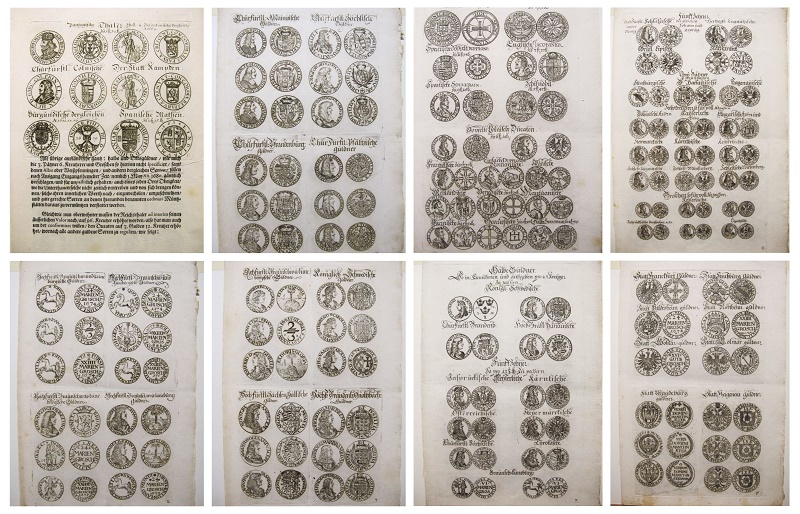 Colección de 8 hojas (estampadas a una cara) pertenecientes al "Münz-Edict des fränkischen, bairischen und schwäbischen Kreises" [Edicto de Moneda del círculo de Franconia, Baviera y Suabia], volúmenes del 12 al 22, publicado en Diciembre de 1671.