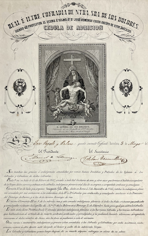 Cédula de Admisión en la Diócesis de Nuestra Señora de los Dolores en Barcelona, con firmas manuscritas del Presidente y Secretario ["Manuel de Villaronga(?) / Esteban Tramullas(?)"] e imagen grabada de la Virgen de los dolores ; "Venerada en su Capilla de P. P. Servitas Por una Ave Maria 1080 dias de Yndulga.".