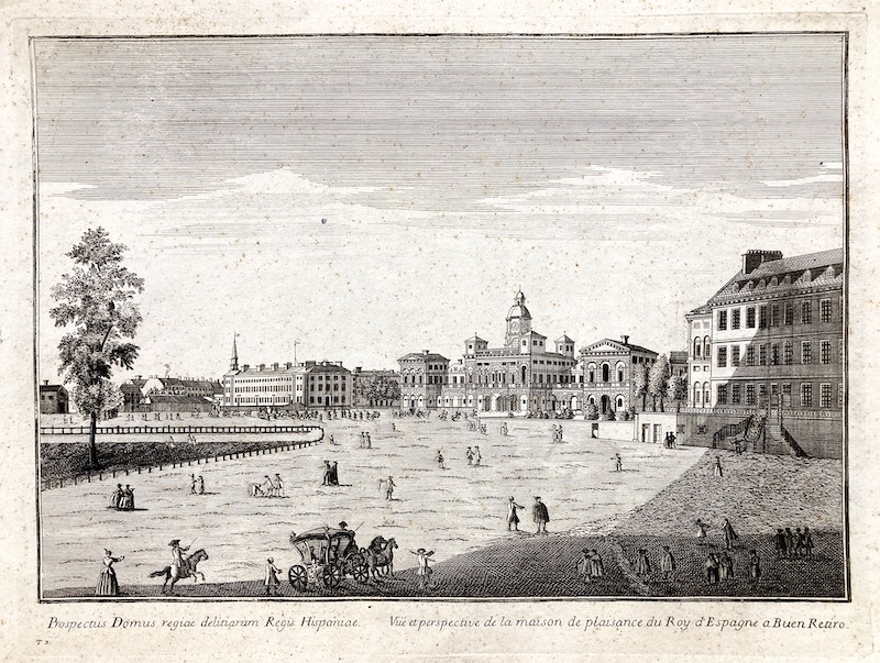 [Un] Grabado representando una vista de la casa de recreo del rey de España en Buen Retiro. Realizado en el siglo XVII, muestra un paisaje idealizado y cuidadosamente diseñado que representa la belleza y la grandeza de la corte española en ese momento. La casa de recreo de Buen Retiro fue un lugar de gran importancia para la monarquía española y fue construido como lugar de descanso y entretenimiento para la familia real y la corte.