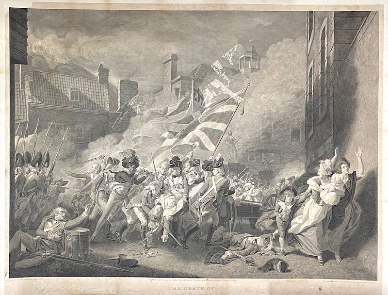 Grabado por James Heath (1757-1834), un grabador británico, que disfrutó del patrocinio de Jorge III y de sucesivos monarcas; en base a la obra de John Singleton Copley (1738-1815), pintor estadounidense famoso por sus retratos de figuras importantes de la Nueva Inglaterra colonial y especialista en escenas históricas, y formó parte, además, de la Royal Academy of Art; y editado por John Boydell (1719-1804), editor e ilustrador británico, reconocido por ayadar a moderar el desbalance comercial que existía entre Inglaterra y Francia en el mercado de grabados, iniciando así una tradición británica dedicada a estas artes.