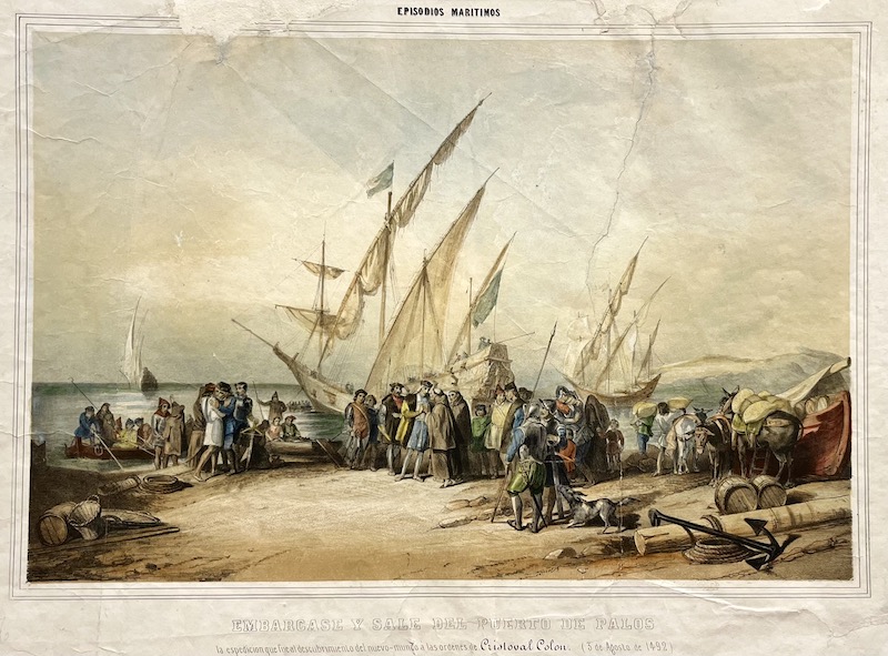 Este grabado muestra la partida de la expedición de Cristóbal Colón desde el puerto de Palos el 3 de agosto de 1492. En primer plano, se observa a Colón rodeado de personas que lo despiden, mientras otros cargan provisiones y enseres. Al fondo, varias carabelas listas para zarpar izan sus velas al viento. La escena refleja expectación, movimiento y un ambiente de despedida histórica. También se ven animales de carga, barriles y redes, sugiriendo los preparativos logísticos del viaje. La composición transmite solemnidad y el inicio de una empresa trascendental: el descubrimiento de América. |