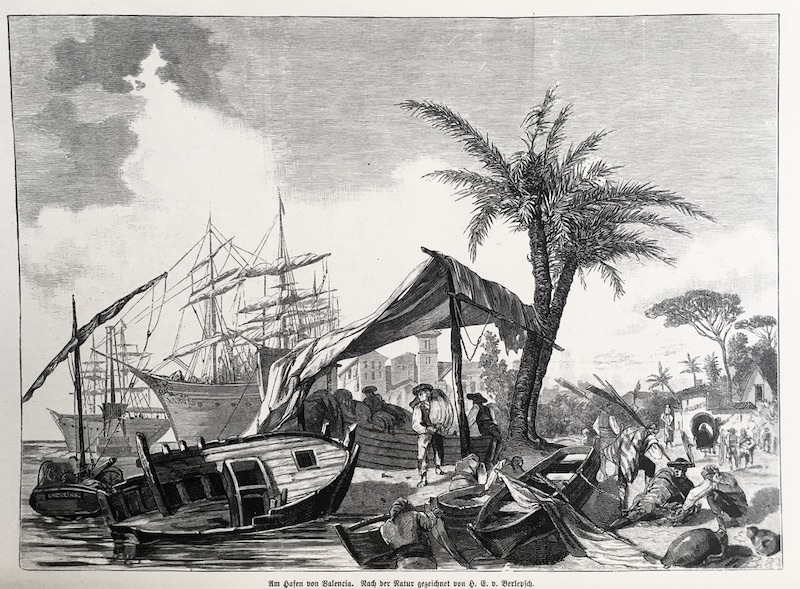 Se representa una escena del puerto de Valencia basada en la obra del pintor y arquitecto suizo Hans Eduard von Berlepsch-Valendas (1849-1921). |
