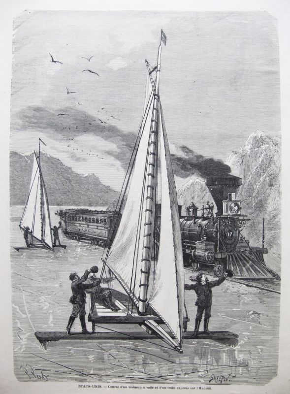 Se representa una carrera de trineos con vela sobre hielo y un tren expreso de época. |