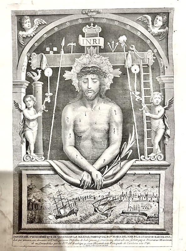 [Un] Grabado representando la imagen títpica del Ecce Hommo (Cristo doliente, Cristo del dolor, Cristo de la paciencia, Cristo pensativo, Cristo en desgracia, etc.), enmarcado por detalles arquitectónicos y flanqueado por dos angelotes armados. Bajo él, se representa una vista de la ciudad catalana de Barcelona desde el puerto con la mar agitada y barcos meciéndose violentamente en ella.