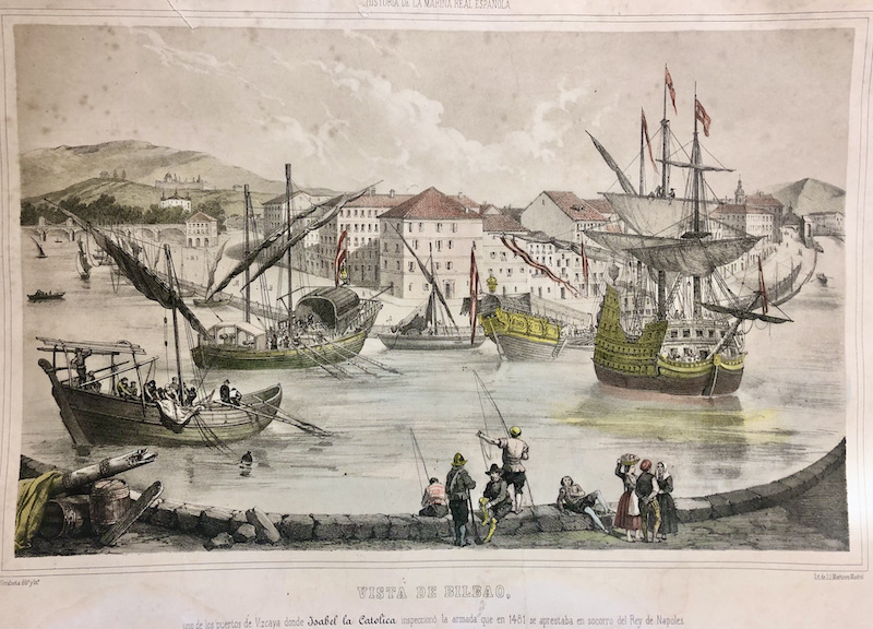 Vista del puerto de Bilbao en el que se ven diversas embarcaciones con banderas españolas y personajes ataviados de época.