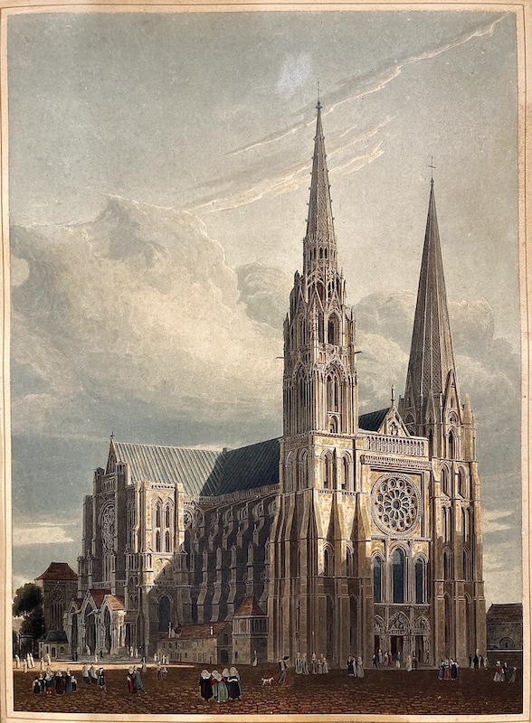 [Un] Grabado al aguafuerte y aguatinta, representando la vista suroeste de las fachadas principal y lateral de la Catedral de Chartres y varios viandantes ataviados de época. Basado en la pintura del artista inglés Charles Wild (1781-1835), un acuarelista conocido principalmente como especialista en arquitectura; y editado por Ackermann &Co.