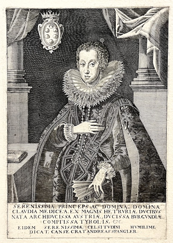 Título completo: "Serenissima princeps ac domina, domina claudia medicea, ex magnis hetruriae ducibus nata archiducissa austriae, ducissa burgundiae, comitissa tyrolis, etc. eidem serenissimae celsitudini humilime dicat, consecrat andreas spangler.". |