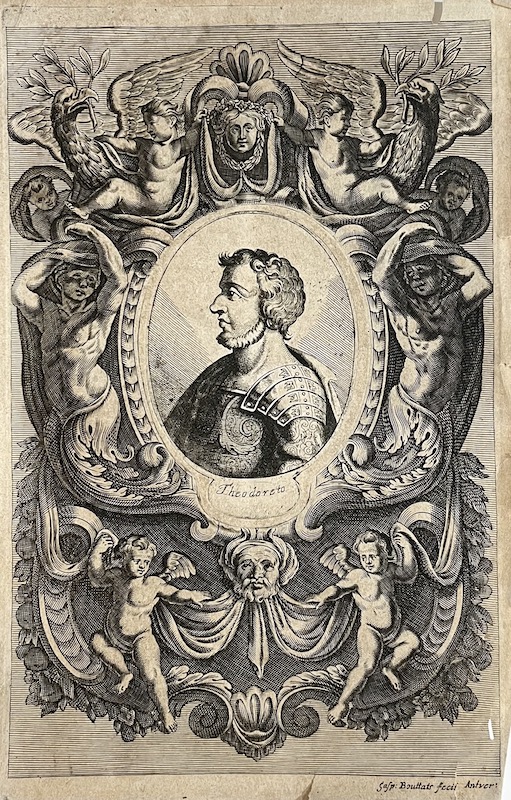 [Un] Grabado representando un retrato, ricamente historiado y alegórico, de Theodoreto.