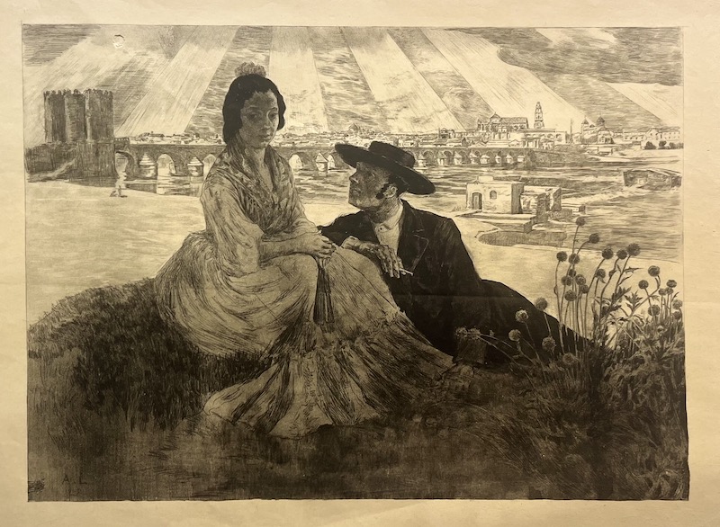 [Un] Grabado litográfico representando una escena romántica y costumbrista donde una pareja descansa sobre una loma frente al río Guadalquivir. Al fondo se distingue la silueta de Córdoba, destacando el Puente Romano, la Torre de la Calahorra a la izquierda y la imponente Mezquita-Catedral bajo un cielo surcado por intensos rayos de luz. Se representa con especial detalle la vestimenta tradicional de los personajes.