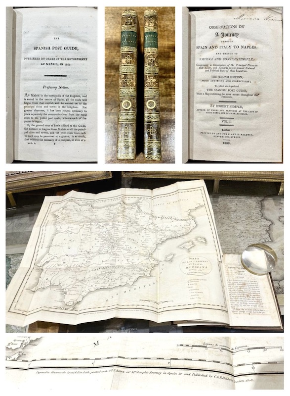 Dos Volúmenes de la obra de Robert Semple (1766-1816) "Observations on a journey through Spain and Italy to Naples; and thence to Smyrna and Constantinople: comprising a description of the principal places in that route, and remarks on the present natural and political state of those countries", editado en Londres en 1808 por C&R Baldwin y que incluye la versión inglesa del mapa de postas de Espinalt plegado.