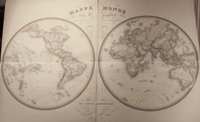 Mapamundi en dos hemisferios dividido en dos láminas de grandes proporciones de la colección de Eugéne Andriveau-Goujon.