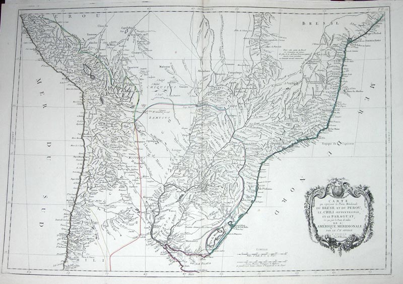 Carte qui represente la Partie Meridionale du Bresil et du Perou, Le Chili septentrional, et Le Paraguay, Ce qui fait la Partie de milieu de L' Amerique Meridionale |