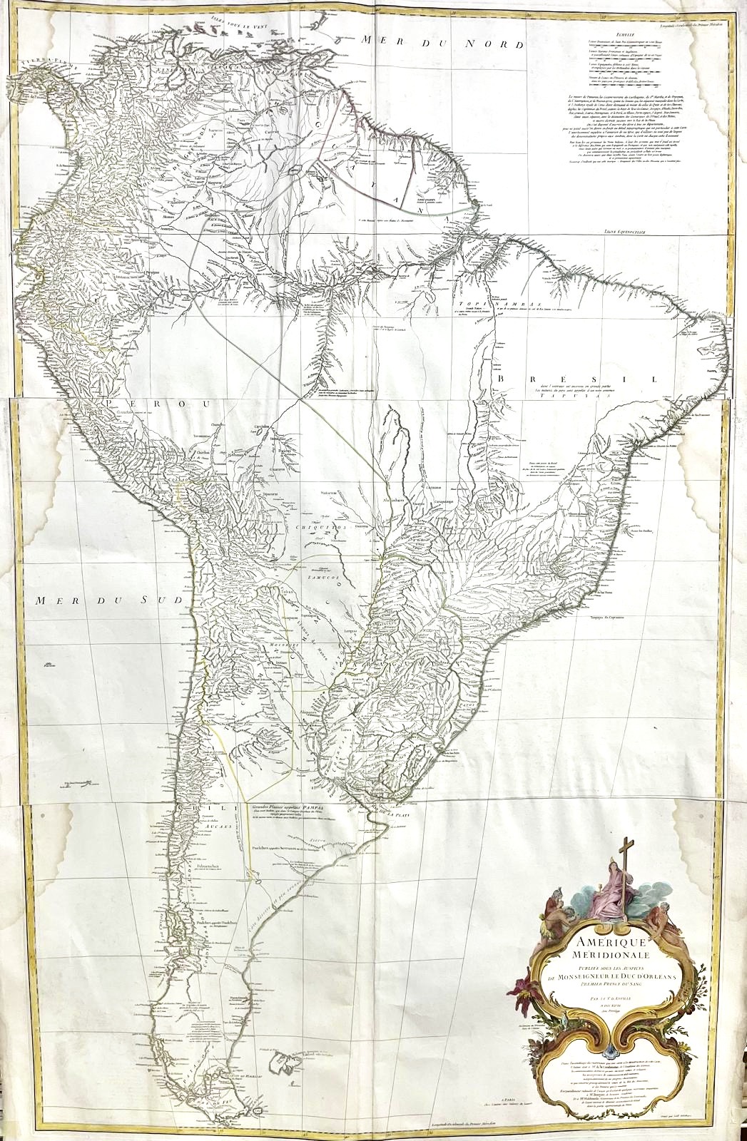 Este mapa histórico representa el continente sudamericano con una precisión técnica excepcional para su época. A diferencia de otros mapas del siglo XVIII que solían incluir elementos decorativos fantasiosos para llenar espacios desconocidos, d'Anville optó por dejar en blanco las zonas de las que no tenía datos científicos fiables, reflejando su compromiso con el rigor cartográfico. La obra presenta una red hidrográfica detallada, destacando las cuencas del Amazonas y del Río de la Plata, así como las divisiones territoriales coloniales, y se distingue por una elegante cartela de estilo rococó en la esquina inferior derecha que incluye alegorías religiosas y figuras indígenas, subrayando la influencia francesa y el patrocinio del Duque de Orleáns.