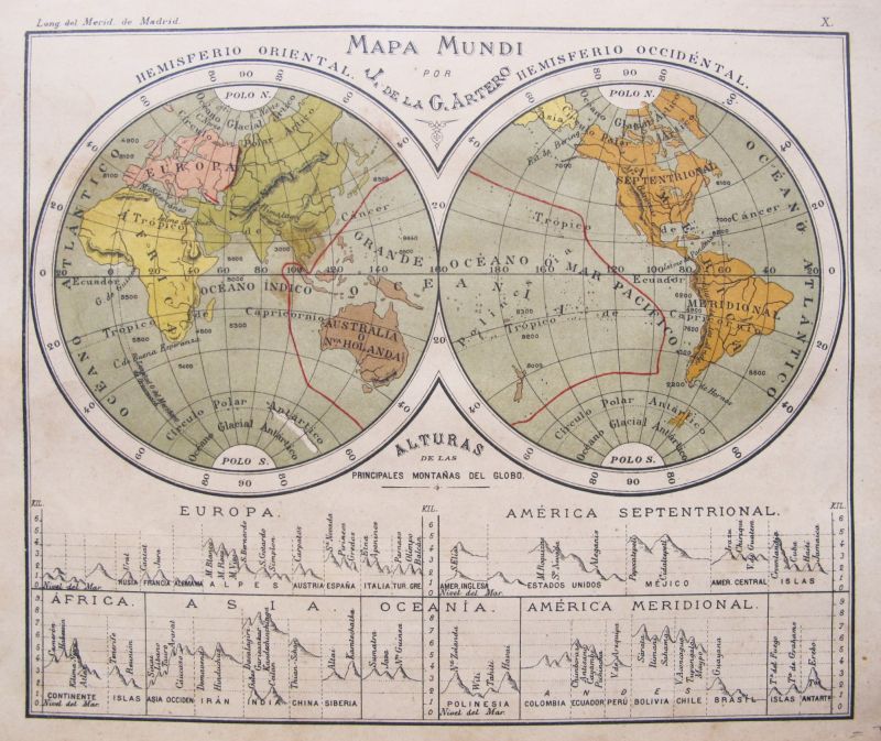 Mapa estampado perteneciente al "Atlas de Geografía Astronómica, Física, Política y Descriptiva para uso de los establecimientos de segunda enseñanza",realizado por Juan de la G. Artero y grabado por Juan Soler.