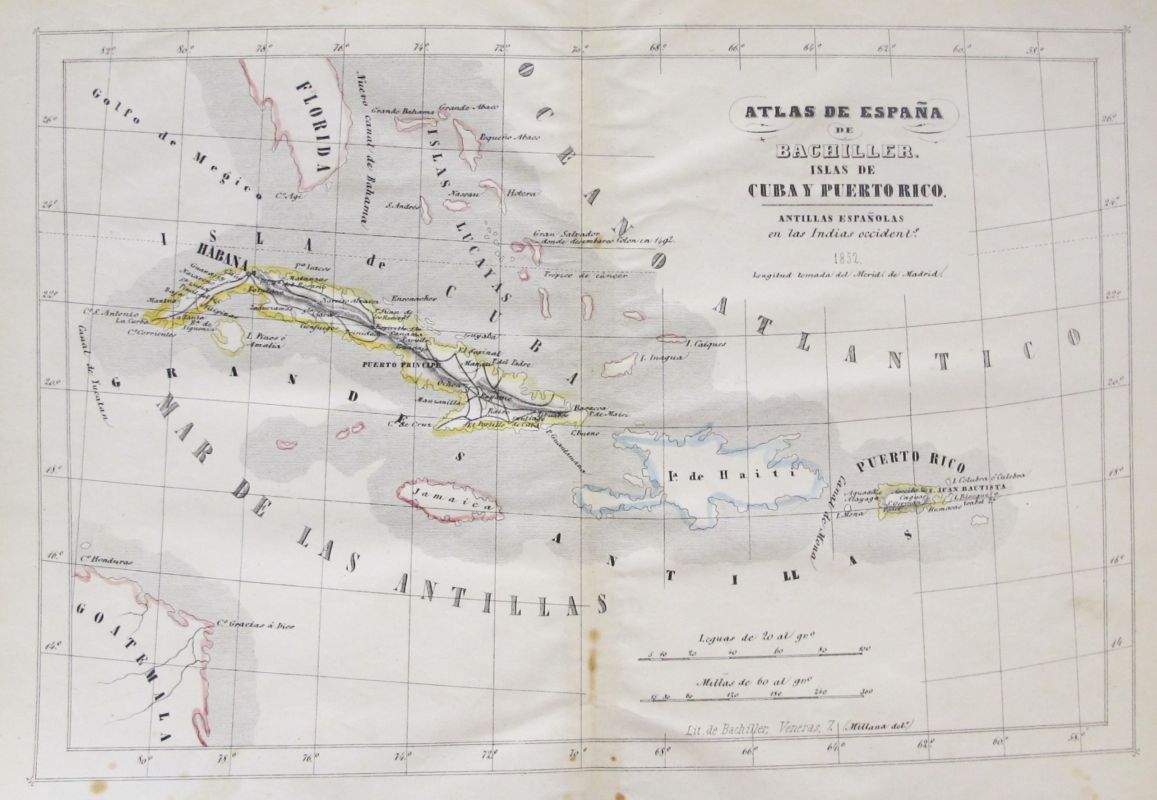 Esta colección se compone de 52 cartas litográficas estampadas en papel fino, en blanco y negro y delineadas a color, que contienen por orden alfabetico las 49 provincias de Espana, islas de Cuba y Puerto-Rico, posesiones espanolas en Africa, é islas espanolas Filipinas, Carolins y Marianas, una grandes mapa en color : "Carta general de Espana con todas sus posesiones de Ultramar é islas adyacentes en 1853" (full original colors). Y 52 hojas de testo esplicativo. Muy raras.