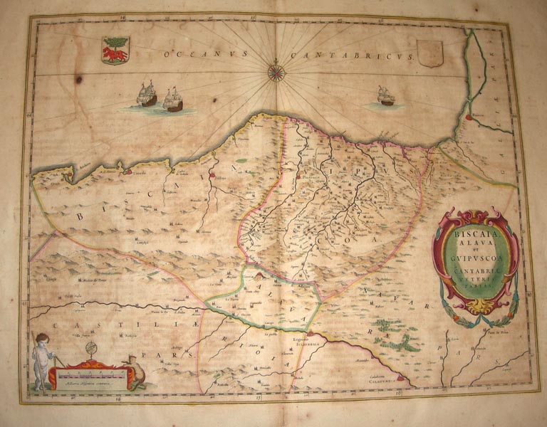 También incluye Cantabria, Navarra y parte de Castilla. "Novus Atlas", posteriormente siguió publicándose dentro del "Atlas Maior", publicado en latín, francés, holandés y español. Con 600 mapas dobles y 3.000 páginas de texto Fue el libro mas grande y costoso publicado en el siglo XVII En la cartela de este mapa aparece el nombre de Alava, que no siempre figura. También tiene pequeñas diferencias respecto a la otra edición. |