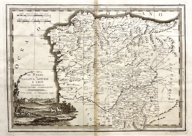 En la esquina inferior izquierda, una elegante cartela decorada con una escena bucólica de caballos y ovejas en un paisaje rural encierra el título y los datos de publicación de la Calcografía Cameral. El mapa incluye escalas en leguas españolas y millas italianas, además de señalar importantes núcleos urbanos de la época como Santiago de Compostela, Oviedo, León y Valladolid.