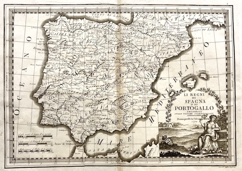 Al igual que otros trabajos de la Calcografía Cameral de la época, la obra destaca por su detallado relieve montañoso grabado y una elegante cartela en la esquina inferior derecha que muestra una figura alegórica femenina sentada en un entorno natural. El documento identifica con precisión las regiones históricas como Galicia, Cataluña, Valencia y Andalucía, además de señalar rutas, ríos y ciudades principales bajo una red de coordenadas geográficas. En la parte inferior izquierda, se incluyen escalas comparativas en leguas españolas, portuguesas y millas italianas, subrayando el carácter científico y analítico de esta pieza cartográfica.