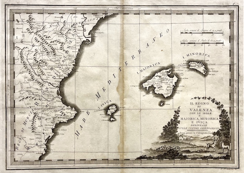 La obra, publicada en Roma, destaca por su estética clásica, incluyendo una elaborada cartela en la esquina inferior derecha decorada con una escena bucólica de ciervos y ganado en un paisaje rural. El mapa detalla la orografía montañosa de la costa este de la Península Ibérica, la delimitación de territorios vecinos como Cataluña y Murcia, y utiliza una tipografía elegante para marcar los accidentes geográficos y las principales ciudades sobre el Mar Mediterráneo.