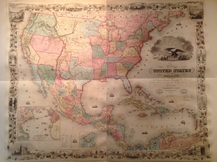 Ejemplar en perfecto estado del Mapa Colton de América, impreso en dos hojas de gran formato que se unen en un mapa de 86 x 108 centímetros, mientras que habitualmente se encuentra despiezado, entelado y plegado .Margenes añadidos para igualar el tamaño de los mapas del "Atlas Choix "de Adriveau-Goujon. |