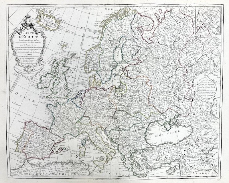 "Dressée pour l'usage du Roy sur les itineraires anciens et modernes et sur les Routiers de mer assujelis aux observations astronomiques. Par G. Delisle Premier Géographe de S.M. de l'Academie Royale des Sciences. A Paris, Chez Dezauche Graveur, possesseur du Fond Gographique des Srs. Delisle et Buache, Rue des Noyers ; Avec Privilege du Roi en 1780.". |