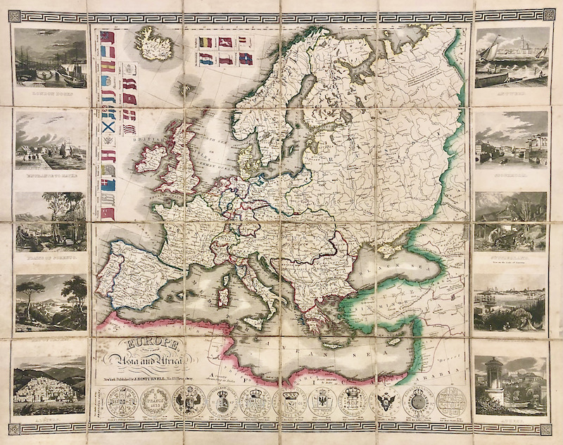 Este mapa en cuestión presenta, además de los continenes de Europa, Asia y África, pequeñas vistas en los márgenes derecho e izquierdo de importantes ciudades como Londres, Estocolmo, Suiza, Atenas, Constantinopla, etc. Y, demás, en el margen inferior, detalla los "Fac-simile of some of the Principal Coins of Europe / Facsímiles de algunas de las Principales Monedas de Europa" .