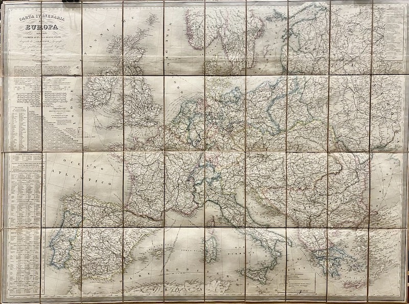 [Un] Mapa entelado y plegado en gran formato de Europa, mostrando los itinerarios enter países vigentes a mediado del siglo XIX.