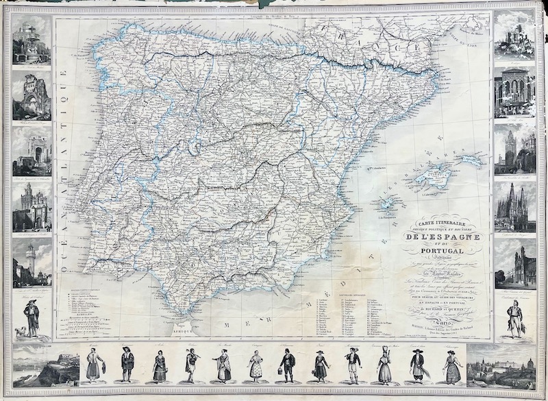 [Un] Mapa de la Península Ibércia e Islas Baleares, representando las rutas y carreteras de la época, con la particularidad de contar con miniaturas de gran calidad y detalle en los márgenes laterales e inferior, representando a personajes ataviados de época y lugares importantes y de gran belleza, como la Giralda de Sevilla o la Catedral de Burgos.