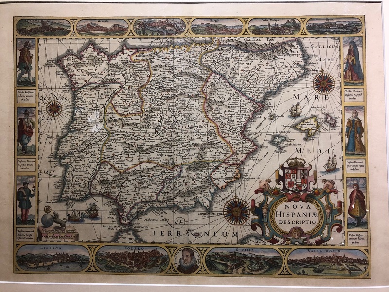 Sorprendente ejemplo del mapa decorativo de Jodocus Hondius de la Península Ibérica, estampado por primera vez alrededor de 1610.
