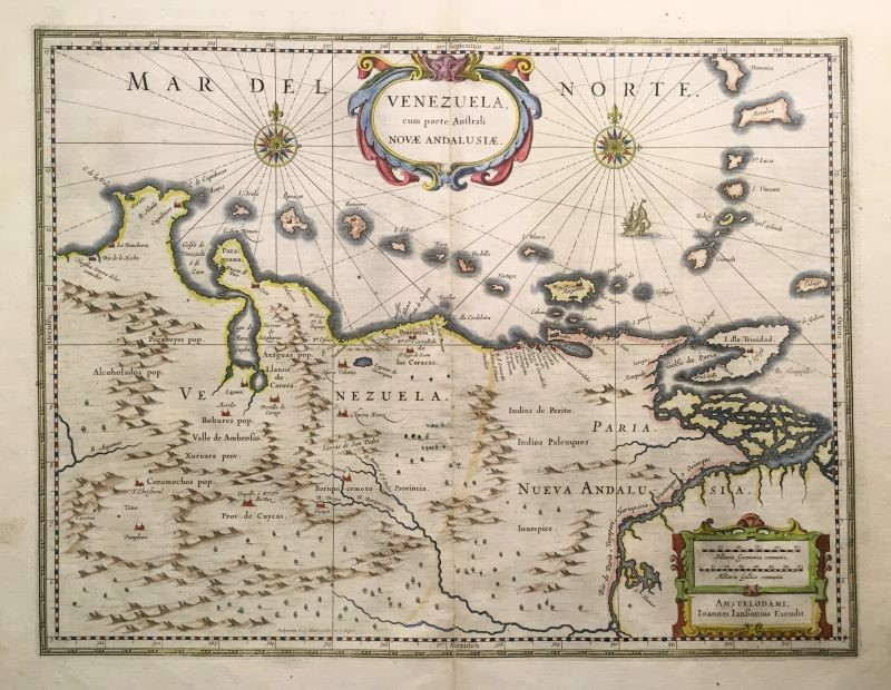 Mapa antiguo original de Johannes Janssonius, estampado para la obra "Theatrum Orbis Terrarum" ó "Novus Atlas", que posteriormente siguió publicándose dentro del "Atlas Maior", publicado en latín, francés, holandés y español, tratándose en este caso concreto de un ejemplar de la edición latina.Un mapa clasico y uno de los mas conocidos de de Venezuela.