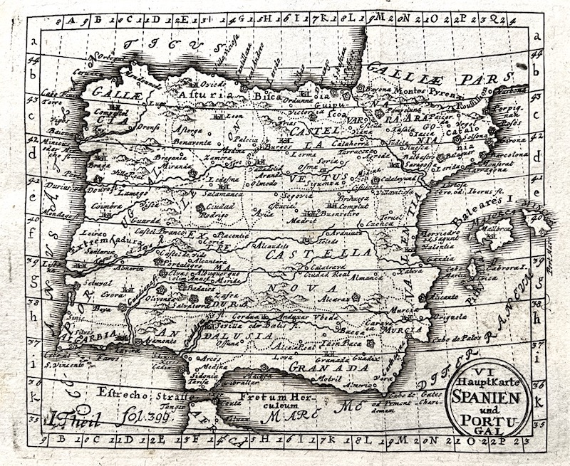 Mapa de la Península Ibérica llevado a cabo por el grabador de mapas austriaco Johann Jakob Lidl (1696-1771).