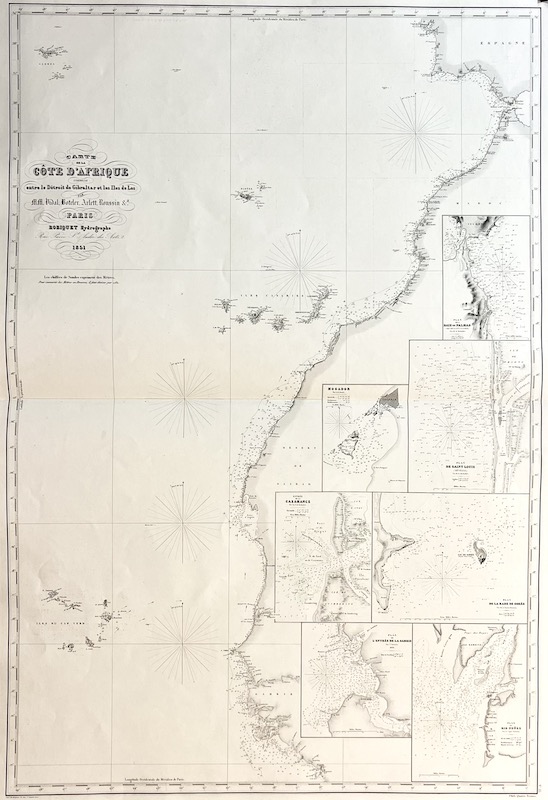 Representando la costa noroeste de África, la zona suroeste de la Península Ibérica, con Portuga y Gibraltar, y detalle de zonas como Baie de Palmas, Saint Louise, Mogador, Rio Nuñez, L'Entree de Gambie, o la Rade de Gorée.