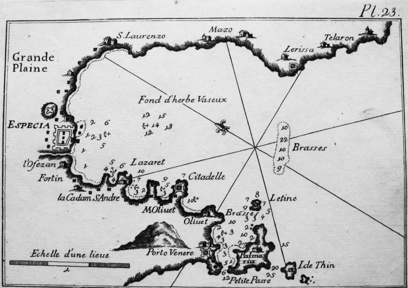 Edición francesa de Livorno. Cada mapa indica la escala, millas, yardas o millas de Provenza. Algunos representan ciudades, fortificaciones, ciudadelas, arsenales, almacenes y anclajes.