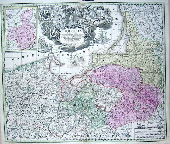 ["Sub fortissimo et justissimo Regimine Serenissimi ac Potentissimi Principis Friderici Wilhelmi [...] Cura et Suntibus. Matth. Seuteri, Sac. Caes. Maj. Geographi. Aug." ; "Cum Gratia et Privil. S.R.I. Vicariatg in partib..."] .