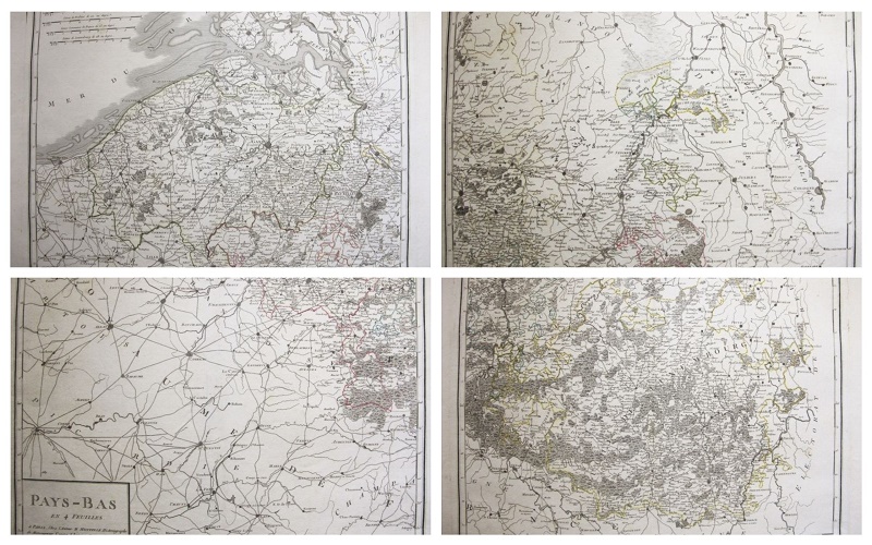 Mapa de los Países Bajos en 4 folios de 40 x 53 cada uno, con huellas de 33 x 44 cms.