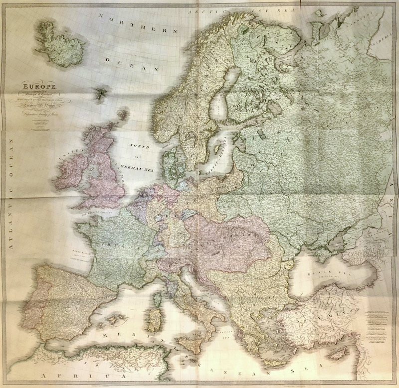Mapa mural de Europa de gran formato, impreso en varias hojas unidas, estampado en blanco y negro y coloreado de época.